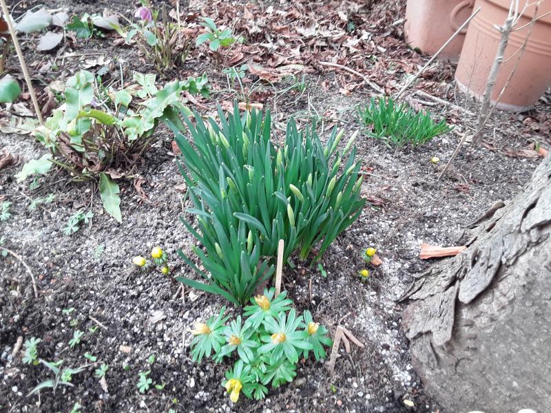 Ich finde auch, dass es ein stattlicher Pulk der kleinen Jetfire ist, Hans-Herbert. Meistens lasse ich bei der Pflanzung schon etwas Spielraum, weil ich nicht so gerne umpflanze. Hier mal ein älteres Foto vom 20. März 2015. Das könnte in diesem Jahr auch ungefähr klappen mit den ersten geöffneten Blüten.