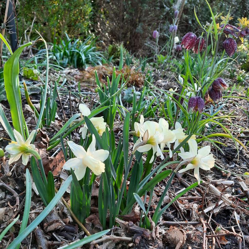 Die Sichtung von Märzfotos hat ergeben, dass neben den kleinen 'Tete a Tete', bei mir nur 'Peeping Tom' zusammen mit Krokussen blüht. 'February gold' und 'February silver', sowie 'Jetfire' und alle anderen Narzissen erblühen hier später.