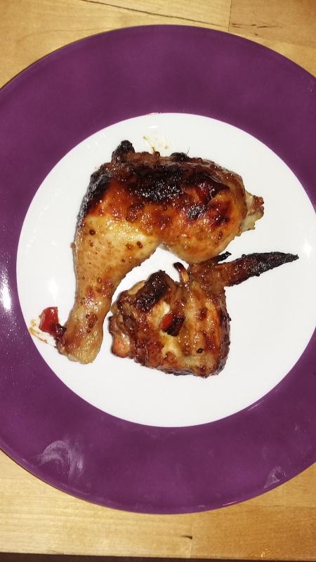 Heute gab es marinierte Hähnchenschenkel und -flügel aus dem Ofen. Die Marinade bestand aus Bitterorangenmarmelade mit Ganzkornsenf, Worcestersauce, Olivenöl und roter Chili.