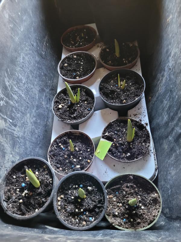 Ich hatte ja davon berichtet, daß ich im Herbst einige Tulpen, Narzissen und Allium 'Forelock ' einfach in ein Sand/ Blumenerde Gemisch getopft hatte. Die 4 Stiegen hatte ich ans Fenster des Gartenhäuschens gestellt. Nun habe ich die Töpfe zum Abhärten auf die überdachte Terrasse geholt. Fast alle Fosteriana Tulpen und Thalia Narzissen sind gut ausgetrieben. Lediglich von dem großen Lauch ist in allen 3 Töpfen noch nichts zu sehen. An einem milden, trockenen Tag kann ich nun die Zwiebelchen in passende Lücken setzen. Im Herbst ist hier einfach kaum ein Durchblick möglich... ;)