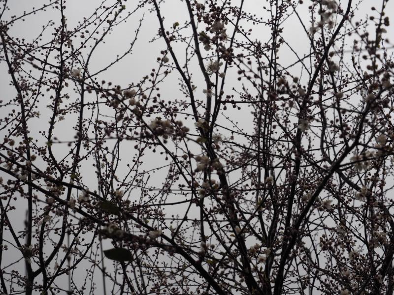 Die Kirschpflaume hier in der Hecke beginnt zu blühen. Sie blüht gleichzeitig mit den Mandelbäumen und eine bis zwei Wochen vor den Schlehen. Die Landschaft im Oberrheintal ist voll von blühenden Gehölzen, weiß mit einem Hauch rosa, hier und da. Am letzten Donnerstag, 9. März waren wir unterwegs.