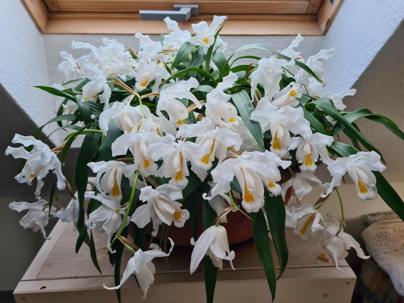 Meine Coelegyne cristata blüht in diesem Jahr mit 19 Blüten an drei Blütenständen.