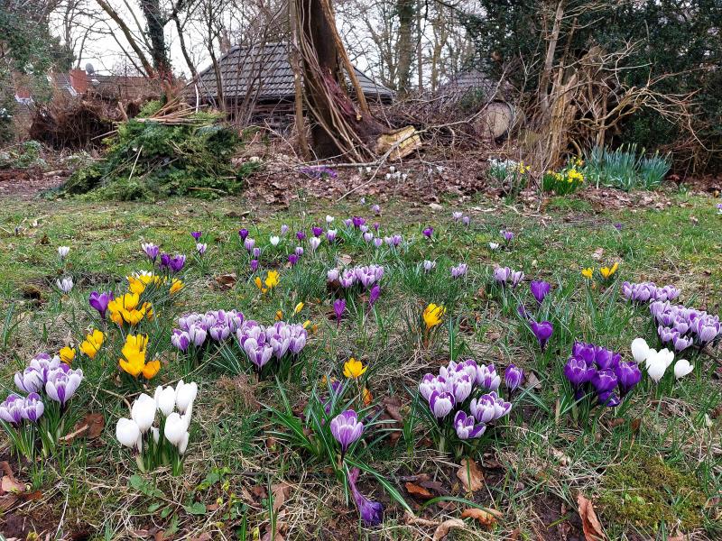 Gold- und Frühlingskrokusse, haben wegen des kalten Wetters lange auf ihren Auftritt warten muessen.