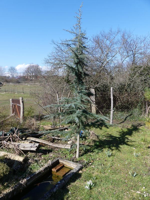 Den Anfang machte Cedrus 'Karl Fuchs', die einem künftig geplanten Pavillon später sicher im Weg stehen würde. Stattdessen soll sie einen Endpunkt der Sichtachse im neuen Garten bilden. Das stand schon länger fest und so hatte ich sie im letzten Jahr schon zur Vorbereitung umstochen. Igendwas um die 3 m wird sie schon haben.