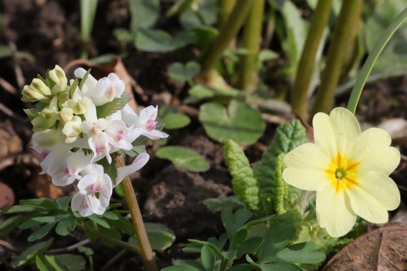Diesmal Corydalis malkensis, der sich zu der hose-in-hose - Form von Primula vulgaris gefunden hat.