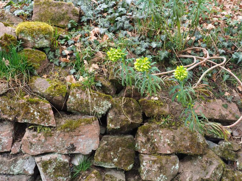 dieses Jahr eine Pracht! Dank Mediterraneus. :-* Forsythia giraldiana. Steht auf der oberen Kante der Trockenmauer und ein Sämling Euphorbia characias hat sich direkt darunter niedergelassen. Hätte ich nie gedacht. Ohne einen Tropfen Gießwasser ist das Ding angewachsen und im heißesten trockenstern Sommer hat es überlebt und blüht jetzt überwältigen. .