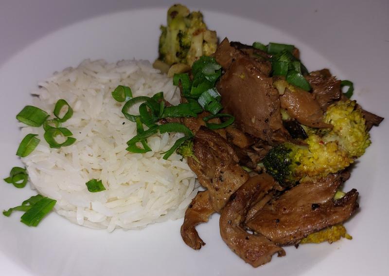 Und heute gab's gebratene Austernpilze mit Brokkoli in etwas Kokosmilch, Endiviensalat