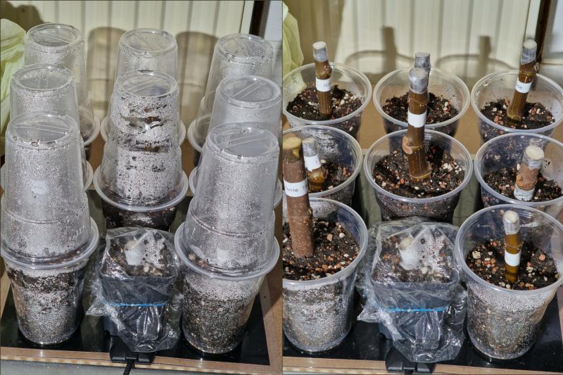Die ältesten Steckhölzer auf den Fotos sind vom 21.02.23 - die haben schon Wurzeln und Austrieb.