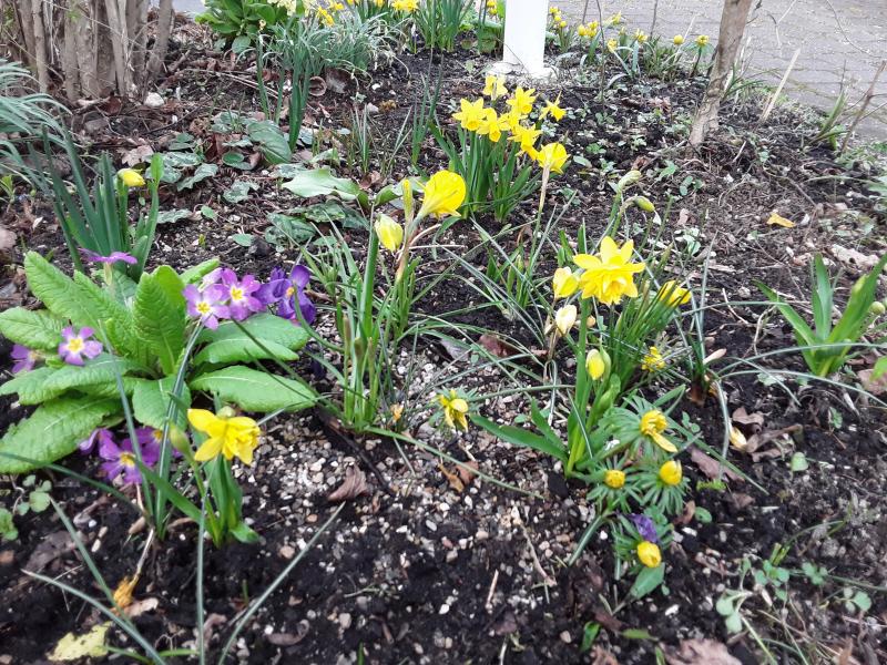 Kurzzeitiger Fastsonnenschein und schon bittet Narcissus 'Winter Walz' Tulipa 'Sunrise (die sich gestreckt hat) zum Tanz. (Den Baueimer für's Gezupfte hätte ich aus dem Bild nehmen können, naja, das ist das wahre Gartenleben...)