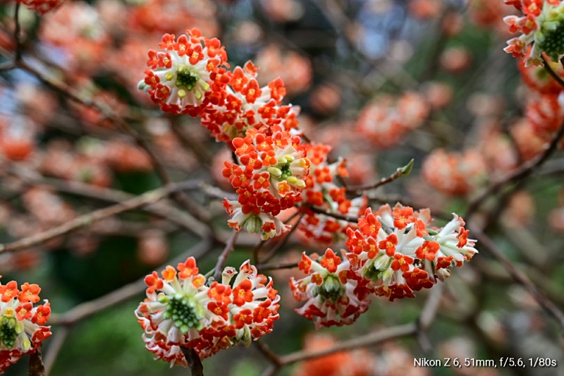 Die zinnoberrot blühende Form von Edgeworthia gestern bei Eisenhut.
