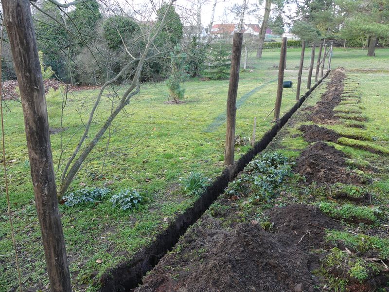 Und dann soll der neue Zaun noch eine Verbindung ins Erdreich bekommen, damit künftig auch der Dachs draußen bleibt, also auf knapp 25 m Länge an der Grenze aufgegraben, Drahtgeflecht eingebaut und wieder zugeschippt. Die Rasensoden klöppele ich dann morgen noch wieder rein.
