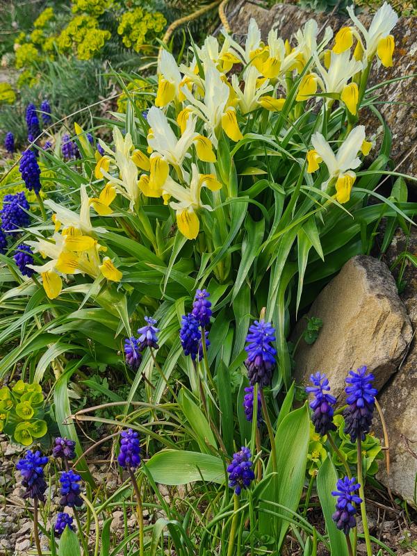 Frühlingskombi am Mäuerchen: Iris bucharia und Muscari latifolia.