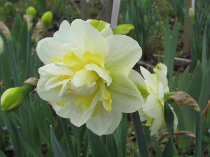 Steht doch zwei Beiträge weiter oben, 'Ice Follies'. :) Die gelbe Nebenkrone wird im Laufe der Zeit noch weiß. Auf jeden Fall eine sehr robuste, zuverlässige und frühe Sorte.