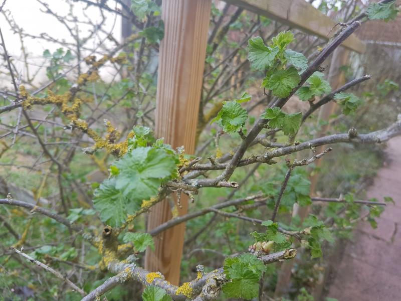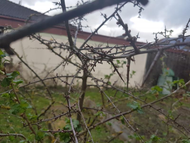 würde auch sagen Stachel- oder Johannisbeere - das sind die ersten austreibenden Beerensträucher. Es gibt auch eine Kreuzung zwischen Stachel- und (schwarzer) Johannisbeere, die Jostabeere