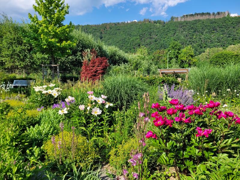 Sterndolden und Hortensie und Pfingstrose und Funkie und im Hintergrund noch einiges mehr.