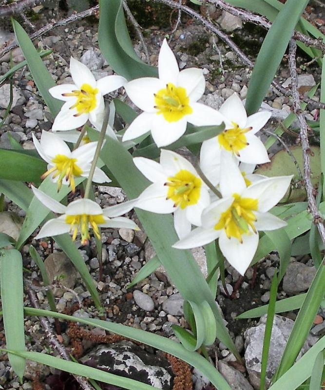 Tulipa polychroma ist eine unstete Tulpe, die nicht aller Jahre gut blüht. In eigentümlicher Gesellschaft mit Leucojum vernum, der sich von selbst an dieser trockenen Stelle eingefunden hat.