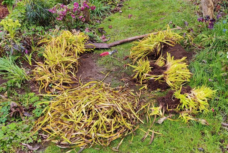 Ich habe mich dann direkt ans Zerlegen gemacht. Ein Stück zurück an die bisherige Stelle, fünf kamen zu Füßen von Hamamelis 'Diane', für zehn weitere habe ich Löcher in den Efeu gestochen, der unter dem Pflaumendickicht im neuen Garten wächst. Mal sehen, wer stärker ist. Wenn sich das Gras behaupten kann, gibt es im Winter nette Farbtupfer.