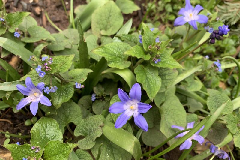 Hier hübschen derweil die wenigen noch blühenden Chionodoxa die im kalten Dauerregen elendig vor sich hin kümmernden Brunnera auf… 😁