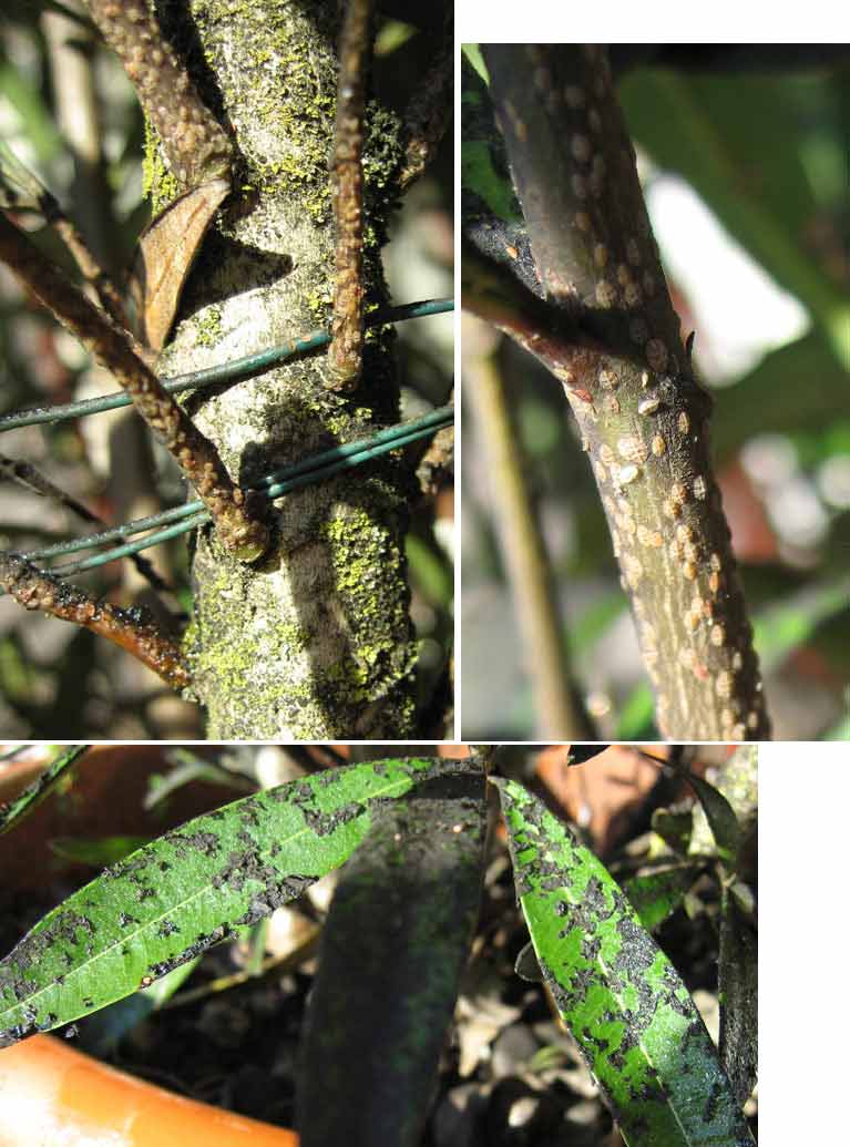 Hallo,Ich hab zuhause einen Oleander, aus dem in letzter Zeit immer mehr Saft austritt. Es scheint auch so, dass alle Blätter und Äste, die mit diesem Saft in berührung kommen, schwarz werden.Ich hab mal ein Paar Bilder hochgeladen.Zudem gibt es bei den Ästen Moosflecken und so kleine, helle "Pickel", sag ich mal ;)Hat jemand von euch eine Ahnung was das sein könnte?