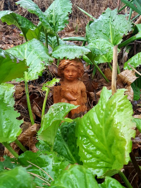 In Charlies Garten sitzt eine überlebensgroße Betonlady die mittlerweile ganz gut mit Flechten und Moos bewachsen ist.