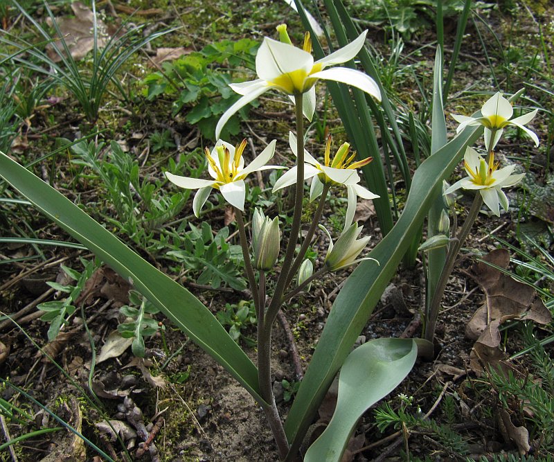 Die Zwiebelchen haben mich unter dem Namen 'Tulipa bifloriformis' erreicht. Die Büte sieht ziemlich identisch zu der der T. turkestica aus. Für mich ist nur die Verzweigung des Stängels auffällig, die nicht wie bei T. turkestica gleichförmig wie bei einer Traube aussieht, sondern nahe beieinander verzweigt und schon fast wie eine Dolde wirkt.