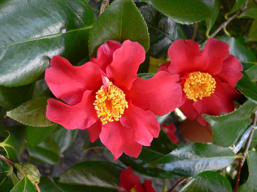Nach all dieser Pracht fällt mir nun wieder ein lang gehegter Traum ein.Ihr wisst sicher alle, dass die Kamellie, aus China kommend und dort von Japanern "abgeholt" wurde - so wenigstens erzählte es mir mein chinesischer Kamellienfreund aus Kalifornien - also, dass die Kamellie eine Tempelpflanze ist. Und dort, wie auch bei manchen Klostern im Tibet, sie vor ca. 500 Jahren eingepflanzt wurde. Dieses Pflanzen war aber aus zwei verschiedenen Sorten, eng zusammen, bis sich aus den zweien eine einzige, sozusagen vermählte, gebildet hat. Und diese hat ganz besondere Blüten. Es entstehen jeweils opposite, also zwei Blüten aus einer Bütenbasis. Jemand meinte, diese Kamellie hiesse Camellia Chungkiangoleosa.Eine andere Sorte - eine C. japonica namens C. Honkongensis oder C. Unryu (??) - wird/wurde auch wegen ihrer auffälligen roten Blüte als Tempelpflanze benutzt, weil sie so schön rituelle Gegenstände symbolisiert.Meine Frage: hat jemand schon einmal davon gehört, bzw. gelesen? oder sie gar gesehen??Stellt Euch nur meine Naïvität vor: ich dachte, ich könnte mir nun mir nichts dir nichts zwei C. japonica zusammenpflanzen, und dann geschähe bei mir das Wunder auch. Inzwischen hat mich aber die Camellia gelehrt, wie man mit ihr umzugehen hat und wie sie dann die Dinge weiter geschehn lässt