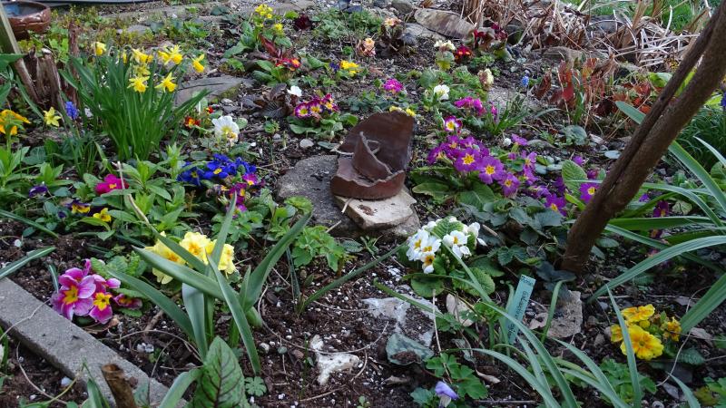 Eine kleine Primelecke die im Sommer mit Himbeeren zum pflücken voll ist.