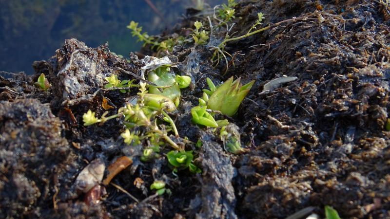 Viele kleine Sämlinge des großblütigen Fettkrautes (Pinguicula grandiflora)haben sich auf den Soden angesiedelt.