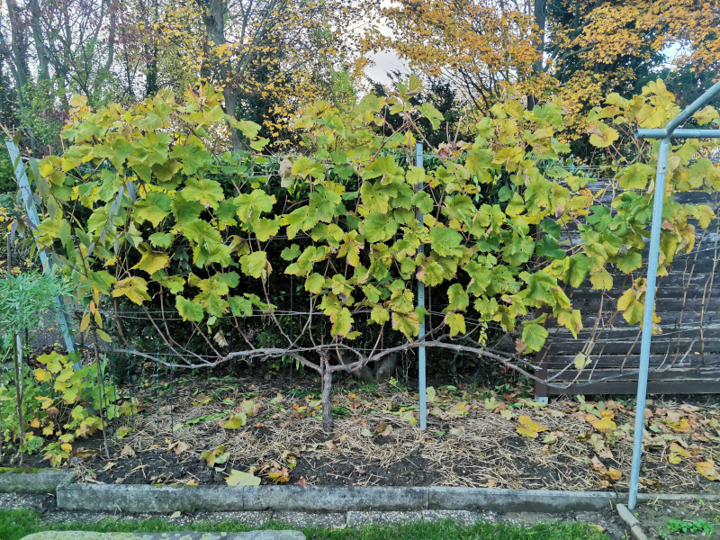 Die Wüchsigkeit ist in diesem Fall sehr erwünscht.Sie muss an dieser Stelle erst 3m in die Höhe und darf dann 4m horizontal wachsen. Vorher war da Straschinski, die schaffte es exakt so weit, leider auch kein Geschmackstreffer und kurzes Erntefenster. Wieder mal Schautrauben.