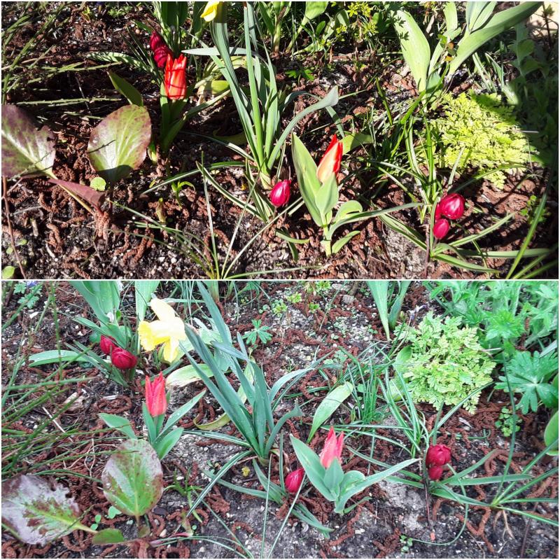 Nachdem sie im Endlosregen leider teilweise sehr braun an den Rändern geworden sind, einige dann nach dem Nachtfrost auch matschig waren, sieht es nun so aus, als würden die Überlebenden doch noch blühen wollen. Tulipa ‚Samantha‘…