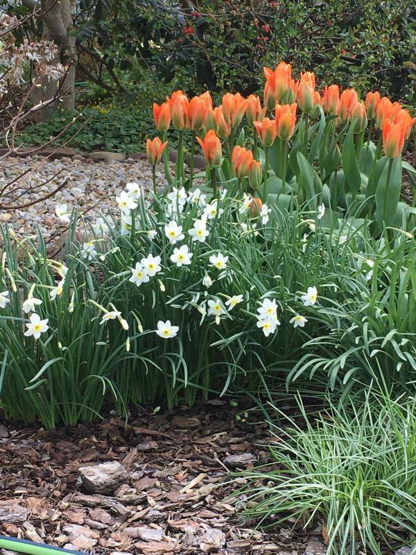 die Tulpe "Orange emperor" zusammen mit kleinblütigen namenlosen Narzissen erfreuen mich jedes Jahr aufs Neue