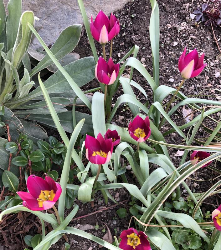 Tulipa kaufmanniana 'Scarlet Baby' - Aubrieta 'Blue Blush Bicolour' - Primula rosea
