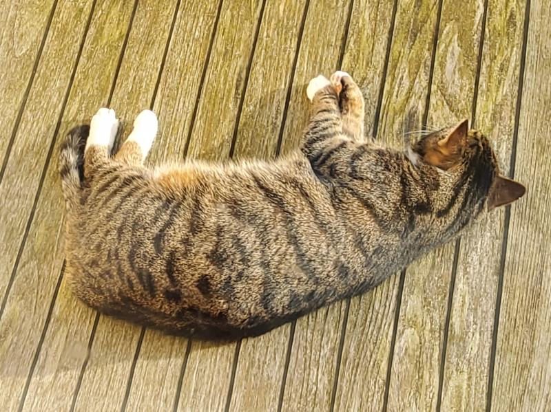 Neuerdings wartet Garfield immer, wenn ich mich im Garten sehen lasse. Wenn ich nämlich einfach morgens die beiden Futternäpfe fülle, passiert es gelegentlich, dass Nachbars Katze oder eine mir unbekannte große Katze vor ihm am Futter sind. Also wartet er, begleitet mich zum Wintergarten, und wenn ich seiner Meinung nach endlich begriffen habe, worum es geht, läuft er vor mir zum Futterplatz. Dann wartet er ungeduldig, dass ich endlich fertig werden. Zum Schluss bekommt er noch einen Stups auf die Nase (bisher die einzige Berührung, die er zulässt), und dann gehts endlich los. Meistens sitzt er am Nachmittag nochmal da und vermittelt mir mit Babystimme, dass er ja schon wieder soooo hungrig ist.