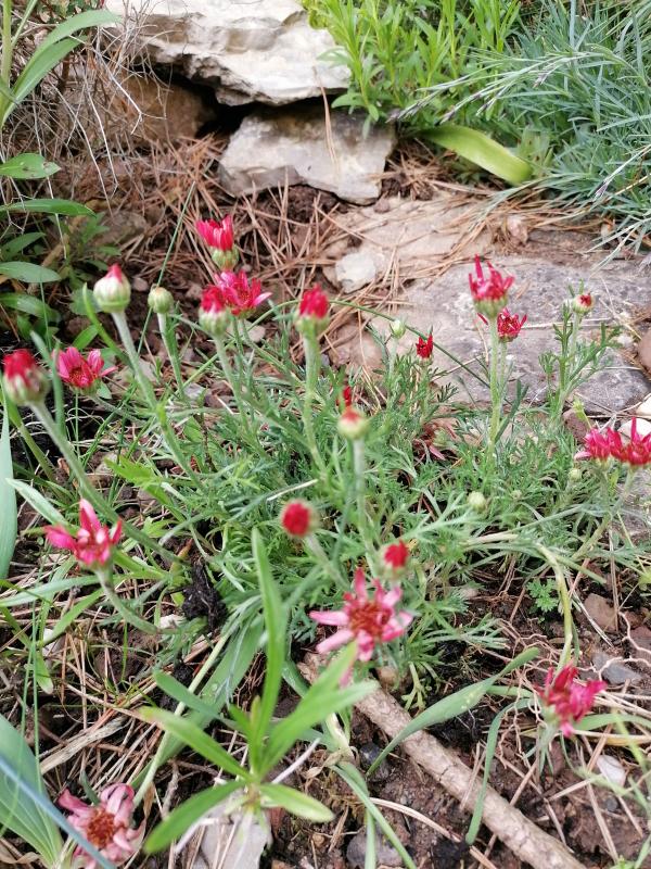 Läuft alles unter Rhodanthemum hosmariense. Obwohl die Pflanzen unterschiedlich aussehen. Die farbigen haben eher nur leicht geöffnete Blüten. Die weiße Form hat größere Blüten, richtig wie Margeriten. Aber ein deutlich schwächeres Wachstum.