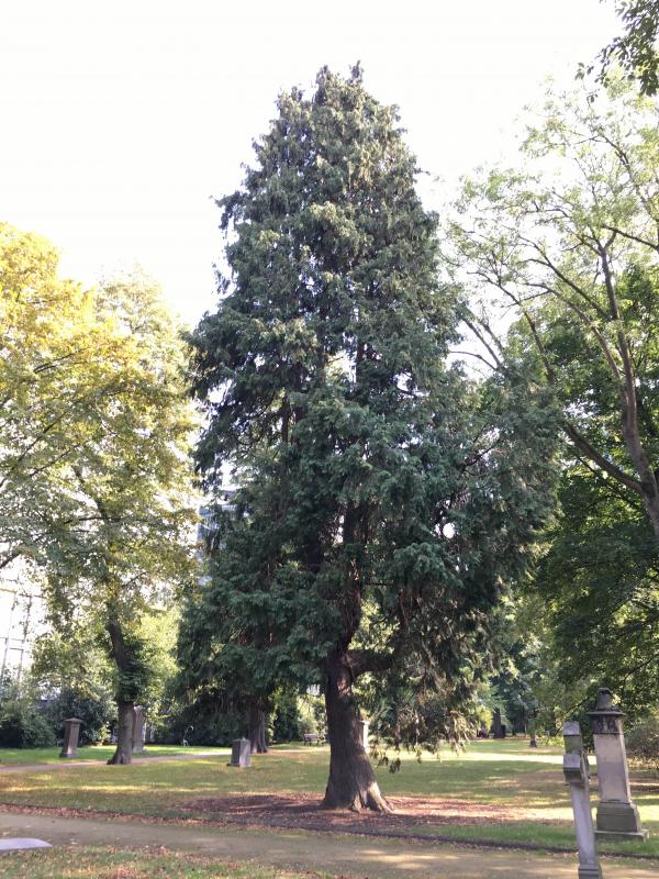 Vom Resthabitus her gesehen am ehesten Lebensbaum. Eibe wäre sehr alt gewesen und außergewöhnlich gradschäftig hoch. Aus den Anpflanzungen im Umfeld könnte sich da noch etwas erschließen.