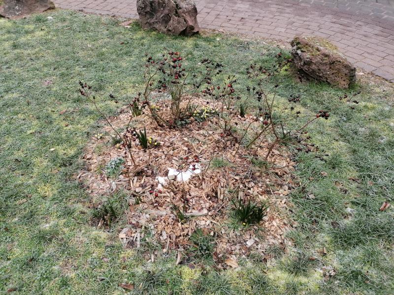 So sah das im Januar aus. Holzhackschnitzel und sehr mickerige rosa Beetrosen. Ich vermute "Bonica", oder "Bayernland".