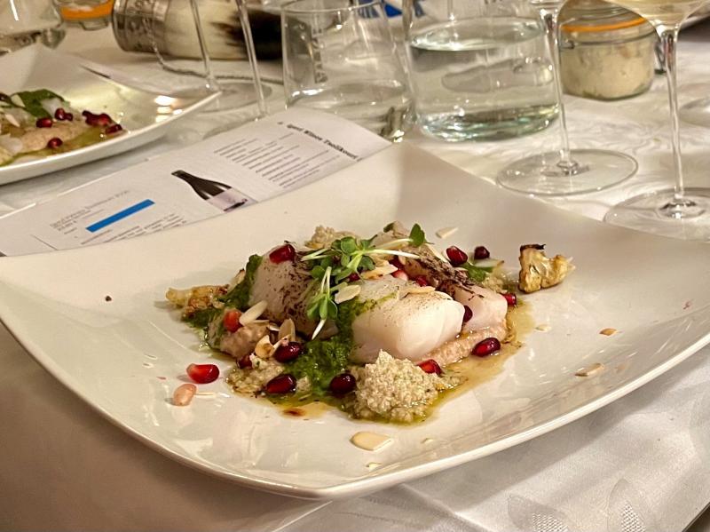 kabeljau mit walnuss-blumenkohlpüree und kindzmari (koriander-chili-sauce)