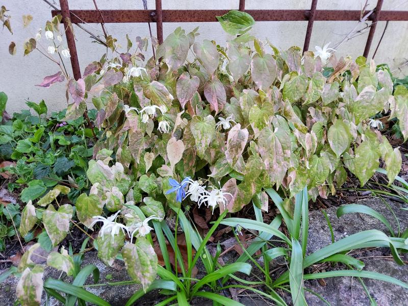 Ob bei anderen Epimedien schon blühen, weiss ich nicht. Hier tun es einige schon seit geraumer Zeit. Manche sind bereits verblüht, manche stehen jetzt in Vollblüte oder mit wunderschönem Neuaustrieb da. Ich finde es nur ziemlich schwierig, mit dem Handy den feinen Zauber der Elfenblumen einzufangen... trotzdem...