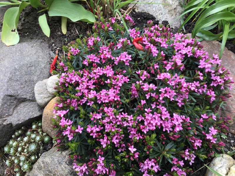 Ist das wirklich Daphne cneorum? Ich kenne den mit spitzen Blättern. Deine Pflanze erinnert mich vom Blatt her an Daphne arbuscula.