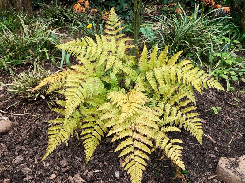 Ich habe gepatzt, als ich im März meinen „Shiny Holly Fern“ gepflanzt habe… indem ich nicht mehr auf dem Schirm hatte, dass da seit dem Herbst auch Athyrium Ghost ganz in der Nähe steht, der ja zu der Zeit noch unsichtbar war. Ich vermute mal, das ist nun zu wenig Abstand zwischen den beiden, oder? Knapp 30 cm. Also werde ich den armen Ghost nun ein zweites Mal ausbuddeln und versetzen müssen. 😒