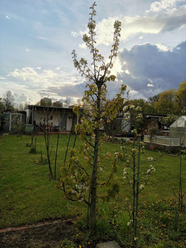 Unterlage ist Maxma 14, also mittelstark. Ich hätte den Mitteltrieb auf 1,50 gekürzt und 3-4 Seitentriebe stehen gelassen.