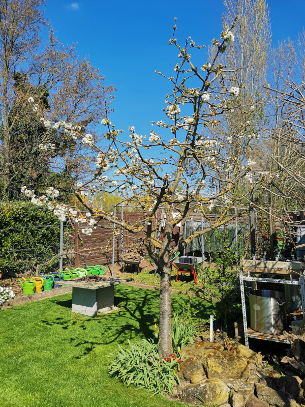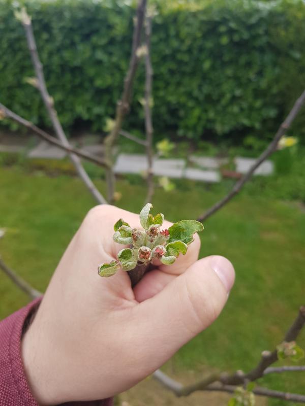 Nun bin ich völlig verwirrt. Ausnahmslos alle Knospen sind Blütenknospen ????? An den Leitästen und an der Spitze sprießen jetzt nur Blüten. Am ganzen Baum sehe ich kaum eine Blattknospe.