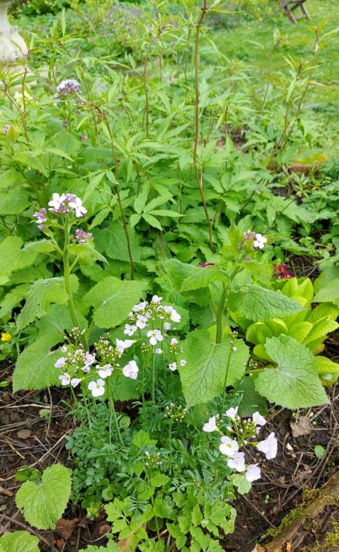 Zum Thema wild wuchern kann ich dieses Dreierlei vom Kreuzblütler anhängen. Davon ist das Wiesenschaumkraut vorne ausgenommen, aber Lunaria rediviva versamen wie die Pest, einmal etabliert, während sich Cardamine bulbifera hinten anderweitig Platz verschafft. Egal, ich wollte es ja wild und heimisch... 8)