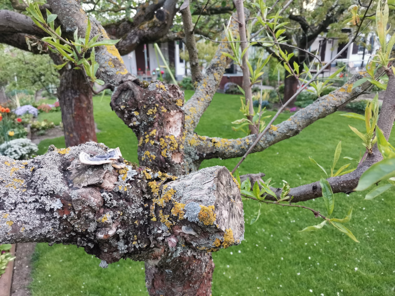 Der alte Pfirsichbaum macht die Biege (Zweigmonilia plus Pflaumenschwamm), aber die o.g. Okulationen retten mir die Sorte.