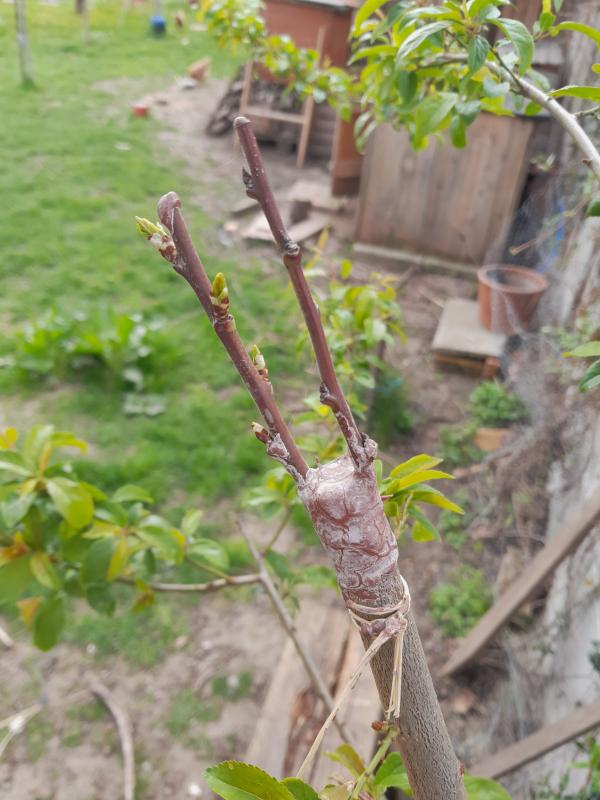 Freu. Eine meiner Ringlotten-Veredelungen funktioniert. 3 Wochen nach Pfropfen hinter die Rinde.