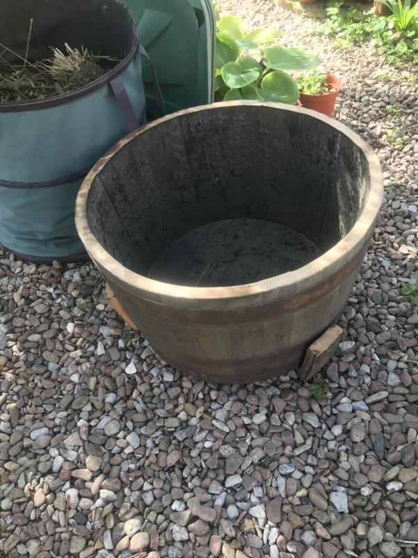 Ah, und das halbe Eichenfass für den künftigen Seerosenteich ist auch angekommen. Ich habe es gleich gespült und erst mal mit Regenwasser randvoll gemacht um zu sehen, ob es dicht ist.