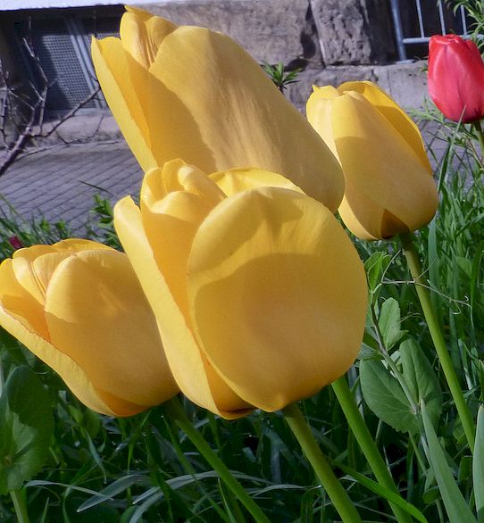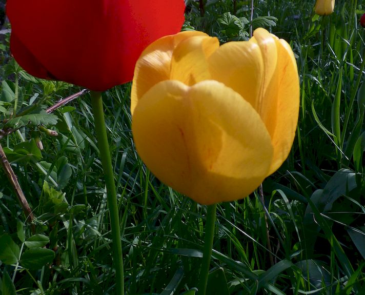 Zwei habe ich gefunden die ein verwaschenes Rot zeigen. Dort gibt es gar keine gelben heuer. Solche Farben sind dort nur aus den Zwiebeln entstanden die ich dort gesetzt habe,