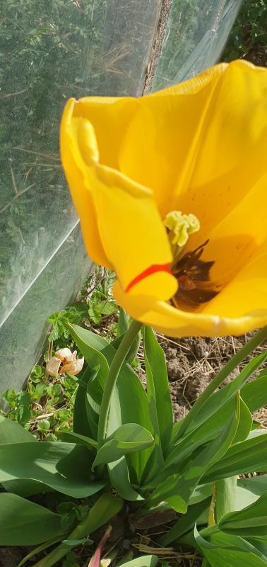 Angeregt durch dieses Diskussion, hab ich mal bei meinen reichlich vorhanden gelben Tulpen geguckt, mir sind diese aufgefallen, es sind mehrere mit diesem mehr oder weniger ausgeprägtem roten Streifen.