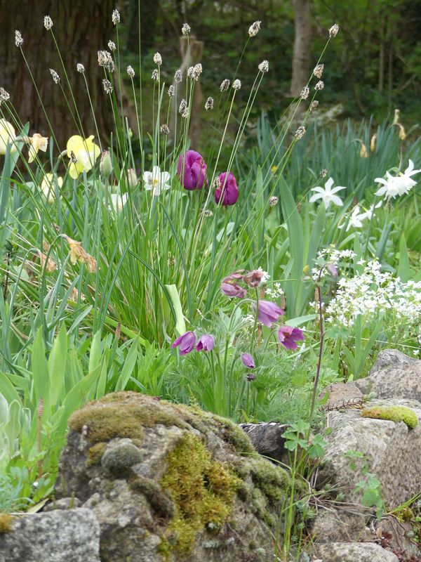Noch bunter eines der Seitenbeete. U.a. Tulpen, Geum.