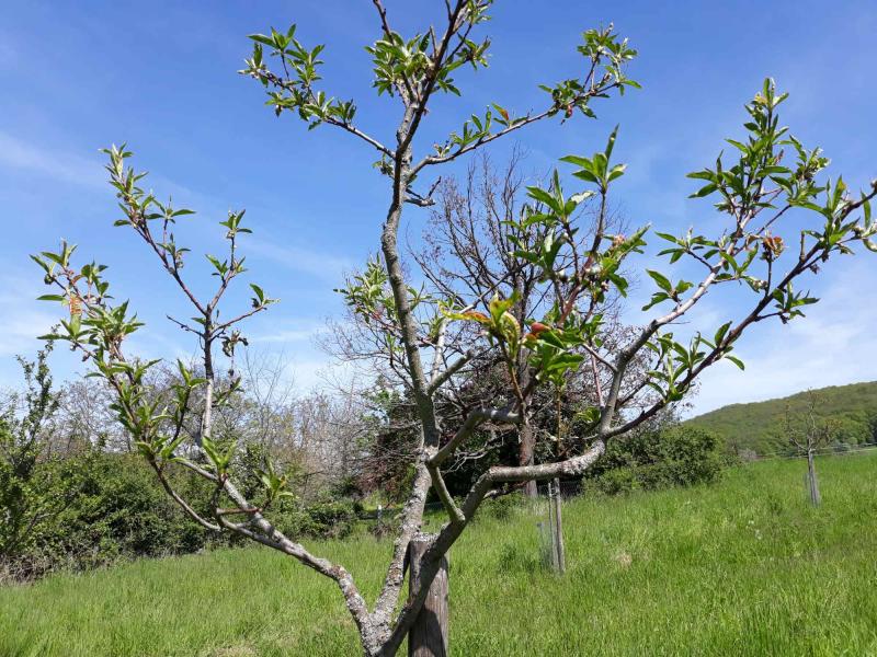 Ohne Spritzung hat mein 9 Jahre alter Weinbergpfirsich einerseits etwas Monilia, wenig bis mittel Ertrag und 100 % Kräusel. Der Baum ist deshalb rotblättrig. Mal sehen was davon übrigbleibt.